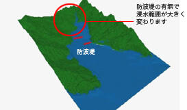 防波堤があることで浸水範囲が明らかに小さくなり、オンライン カジノ 評価の被害を低減させることが分かります。浸水範囲を減らすことで、被害範囲が減り、避難する距離も短くなります。同時に浸水までの時間を稼いでいます。※シミュレーションは特定の条件を仮定して行っています。