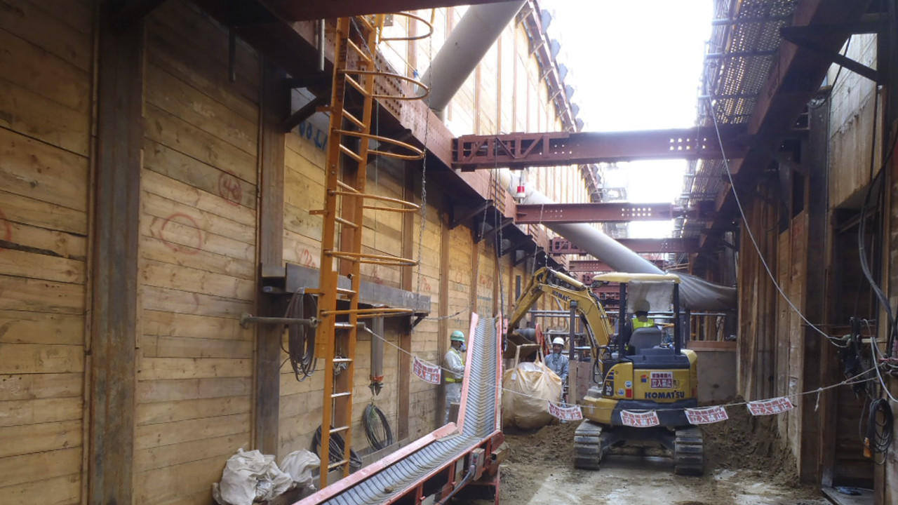 ここでは、大林組で開発を進めてきた「斜め自立土留め工法」を採用。実用の場として注目されている。