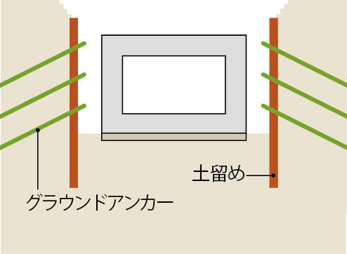 - ※1 グラウンドアンカー 土留め壁が内側に倒れないように、土留め壁に開けた穴から鋼線などを挿入し、セメントモルタルを注入して、地中の基盤部分から土留め壁を引っ張って支えること