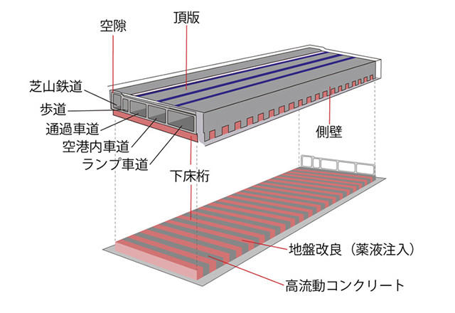 20本の導坑と交互に配される地山は薬液を注入して地盤改良し、強度を確保。こうして、コンクリートと地盤改良部分が交互に連なる梁構造が形成され、オンライン カジノ スロット 無料を下で支える下床桁が完成する。