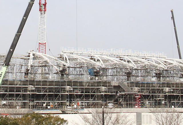 並び始めた屋根鉄骨は、大林組の工区で33体。最後、一気に白い膜屋根を張る。