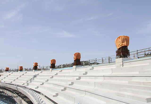 PC(プレキャストコンクリート)板の活用はその一つ。客席部分のベースには段床PC板、スタンド先端部には鼻先PC板を採用した。現場でコンクリートを打つのではなく、工場で製作されたPC板を組み立てていく。確かな品質を保ちながらも工期を短縮でき、仕上がりも美しい。