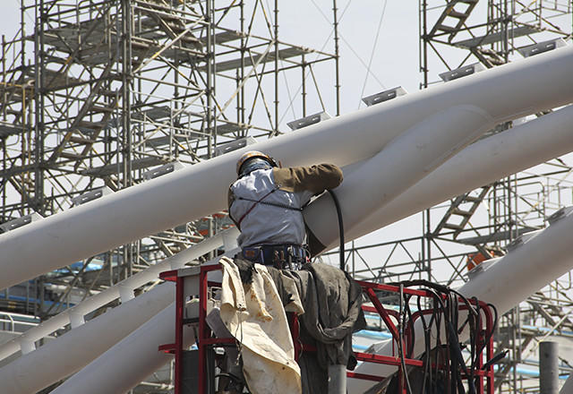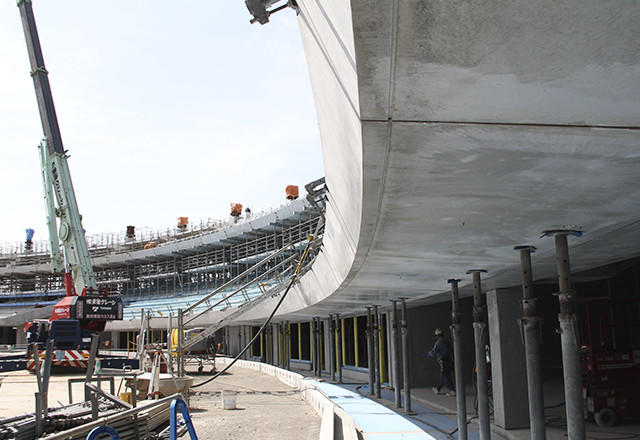 施工の手順にも工夫がある。下層スタンド構築、上層スタンド構築、屋根鉄骨据え付け。この繰り返しが施工の大まかな手順になるが、高さよりも横の距離に圧倒的なかさを持つこの施設、ビルを建てるように、1フロアごとに積み上げていたのではロスが多い。