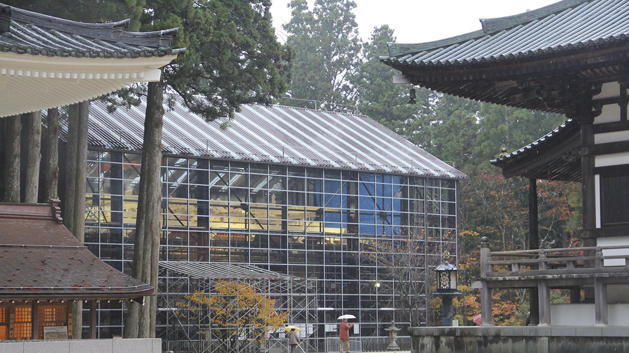 高野山の開創は弘仁7(816)年。かの時代、宗祖である弘法大師はどうやってこの地に来たのだろう。思わずそんなことを考えてしまうような高地に現場はある。道中、急こう配の山肌をケーブルカーで一気に登る。それはまるで雲の層を一つ突き抜けるような感覚だ。