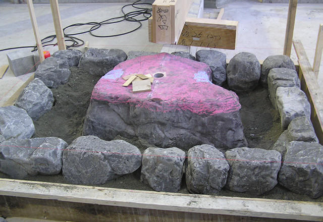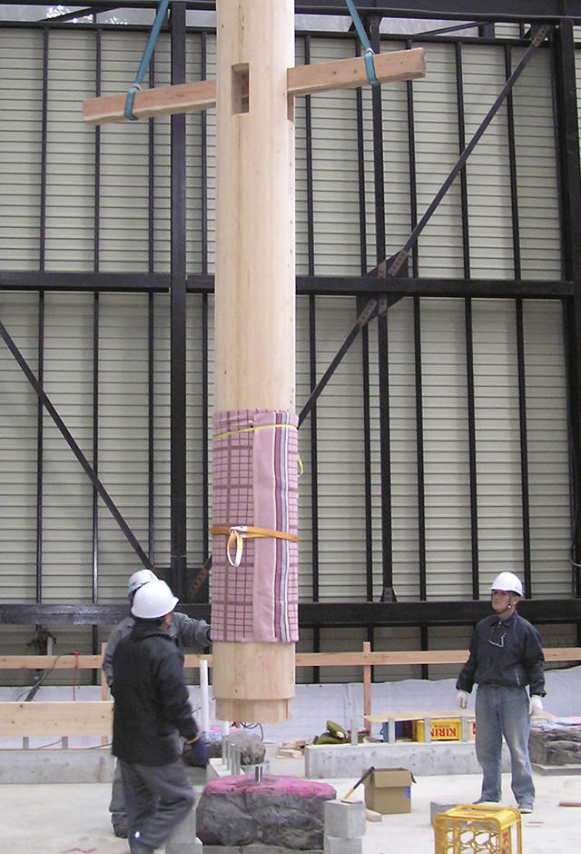 全18本の柱が置かれるのは自然石。その表面の凹凸に合わせて柱底部を削る作業を繰り返し、接合面をぴったりと密着させる。こうしてできた精巧なかみ合わせと、上部から加わる構造物の重みで柱が安定するという伝統の技だ。この作業に約50日間が費やされた。