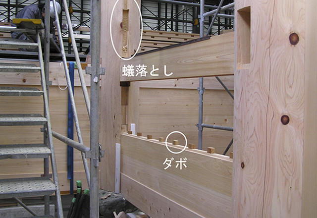 さらに、上下の板壁と板壁を「ダボ」という木片で接合。これらの相乗効果で、釘を使わずしても部材同士が固く結び合い、大きな揺れがあっても一体となって崩壊するのを防ぐというものだ。