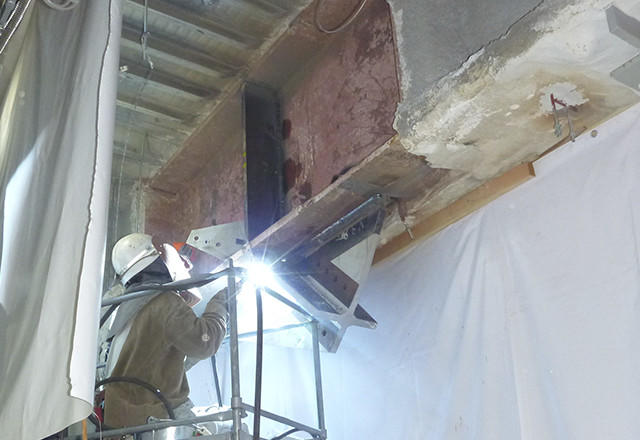 ダンパーは、まずガセットプレートと呼ばれる鋼鈑を架構内の3ヵ所に溶接し、これにY字や八字の形で取り付ける。一見単純そうに見える作業だが、実は作業員たちの熟練の技がなければ成り立たない世界がここにはある。
