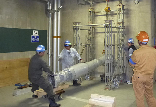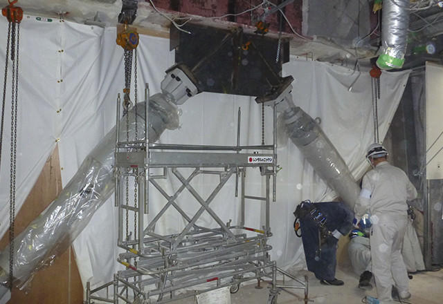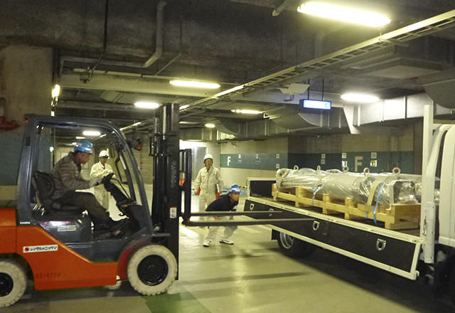 想像以上に難敵なのがダンパーの揚重作業だ。ダンパーは幅2.5m、奥行き1.6m、最大高4.0mという狭い貨物用エレベーターにぎりぎり入るサイズ。治具(台車)を使って運び入れる。治具は大林組大阪本店ビルケアセンターの協力を仰ぎながら、エレベーターに納まる大きさで十分な強度を満たすものを設計。地下のストックヤードで何度も強度試験を繰り返し、ようやく作り上げた。