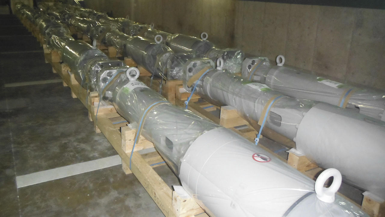 工事は庁舎内部の梁や柱で囲われた架構内を制振ダンパー(以下、ダンパー)で補強することで、建物の揺れ方を小さくし、共振の発生を抑制することを狙う。使用するのは、突っ張り棒のように踏ん張って建物剛性を強化する鋼製ダンパーと、車のサスペンションのように揺れを吸収するオイルダンパーの2種類。共に1基が最大長3m、重さも1tクラスという巨大なダンパーだ。