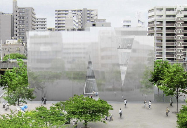 建物外観は淡い鏡面のアルミパネルを使用した。外壁にやわらかく下町の風景が写り込み、建物が地域の風景に溶け込むことをめざしている。