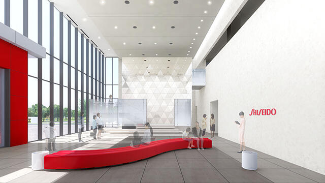柱や壁には、資生堂のコーポレートカラーである赤色をアクセントとして配され、充てん・仕上げ室からは、作業をしながら空が見えるよう高い位置に窓が配置された。商品の変質を避けるため、窓ガラスには遮光・遮熱対策が施されている。