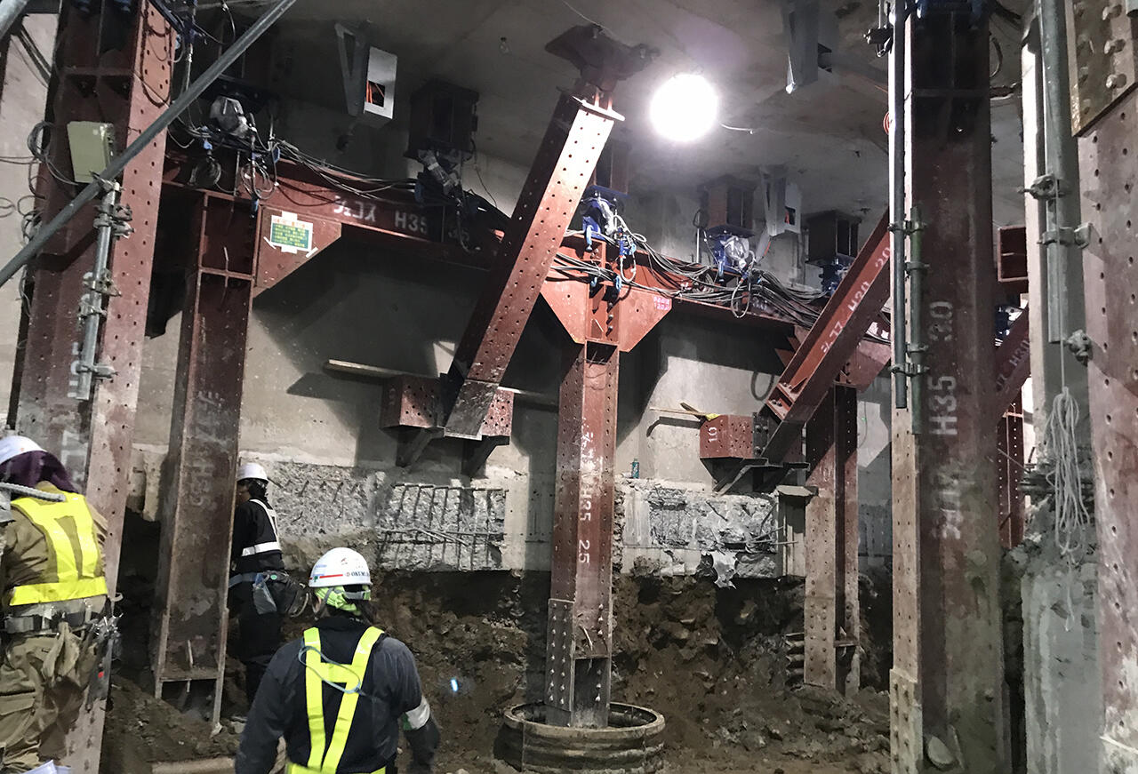 施工場所を含む周辺一帯には供用中の電線やガス管などのインフラ設備と、供用終了後残置されたインフラ設備が混在していた。まず既存設備の調査から始まった。発注者から提供された旧ビルの竣工図や設備図などをもとに、一つずつ現地で位置確認をし、使われていない設備の撤去作業などを実施。万一、誤って重要な電線を切断すれば、列車運行に支障を来し、自動改札が機能しないなど大問題に発展する危険がある。