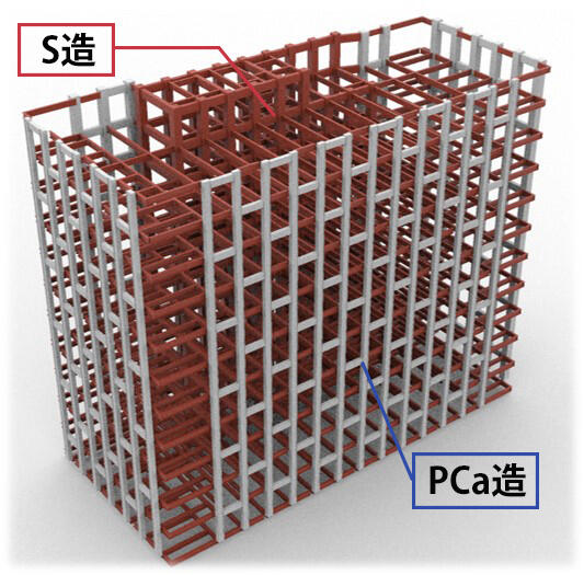 今回の工事では、高いデザイン性と耐震性能を実現するため、プレキャスト鉄筋コンクリート(PCa)造と鉄骨(S)造を組み合わせたハイブリッド構造を採用した。PCaは、現場で型枠を用いてつくるのではなく、あらかじめ品質管理の行き届いた工場で製作される。そのため、品質が均一で精度の高い安定した部材となる。